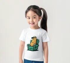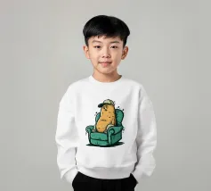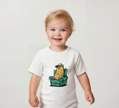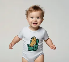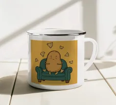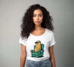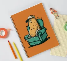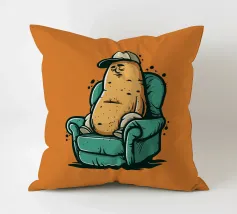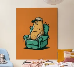 Illustrazione a fumetti di un personaggio a forma di patata con un berretto, comodamente sdraiato su una poltrona verde su un vivace sfondo arancione. La posa rilassata e i dettagli espressivi trasmettono umorismo e pigrizia in un disegno spensierato.