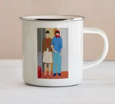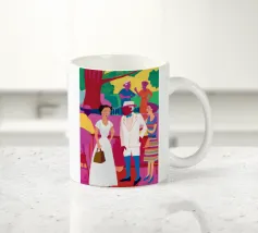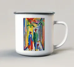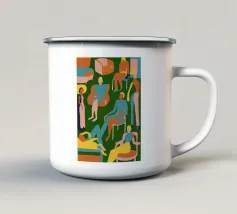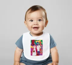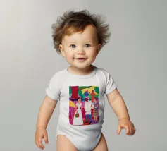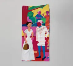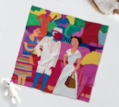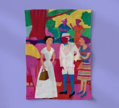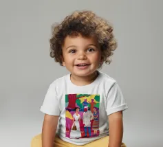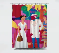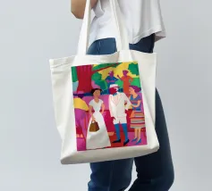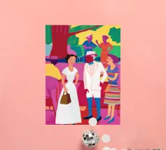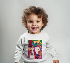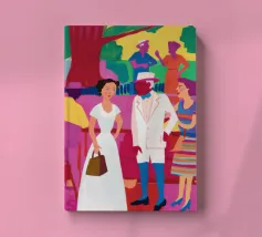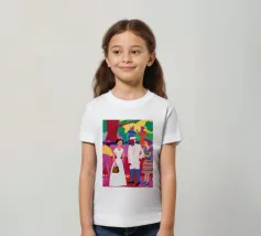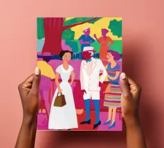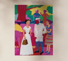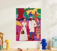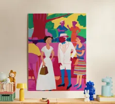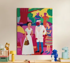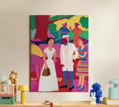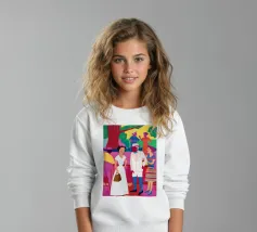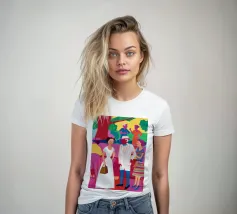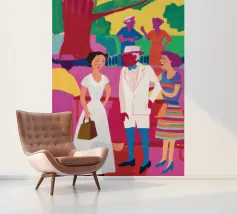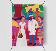Un'illustrazione vivace di un gruppo eterogeneo di amici vestiti con stile che camminano insieme, resa in uno stile audace e colorato che celebra l'amicizia e la moda.