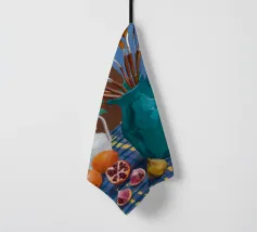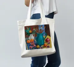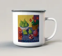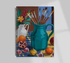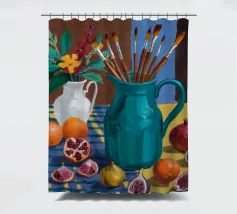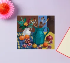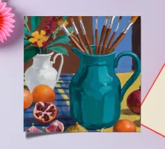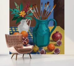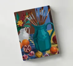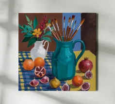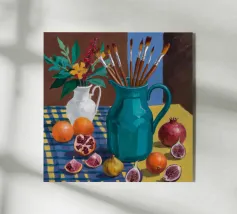 Una natura morta che celebra gli strumenti dell'artista, con una brocca turchese piena di pennelli accanto a melograni e arance. La composizione su sfondo scuro è un omaggio al processo creativo.