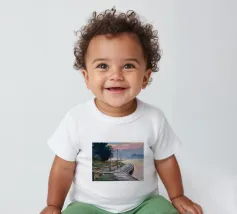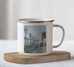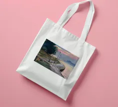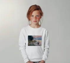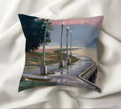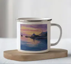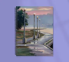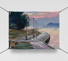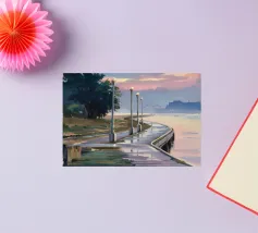 Un sentiero costiero immerso nella luce calda e soffusa dell'alba o del tramonto segue la costa. L'acqua tranquilla e le colline lontane creano un'atmosfera pacifica, contemplativa e nostalgica.