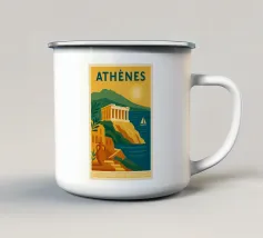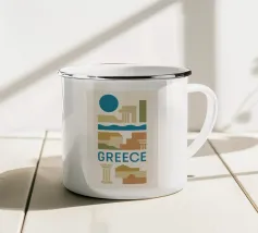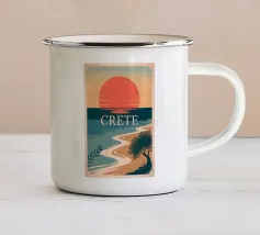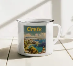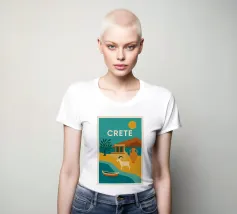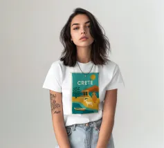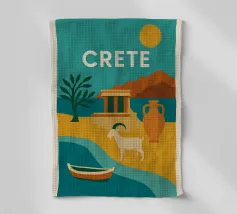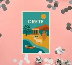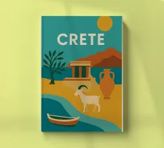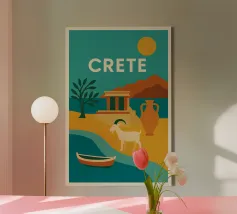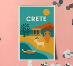Con le sue capre selvatiche, le antiche rovine e le imponenti giare, questo poster evoca Creta in tutta la sua ricchezza. Con i suoi colori audaci, il sole ramato e la costa chiara, il più grande gioiello del Mediterraneo emerge come una leggenda visiva. Un vibrante omaggio a un'isola eterna.