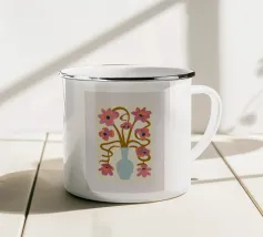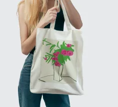 Un vaso con una vegetazione lussureggiante e fiori rosa vivaci è raffigurato su uno sfondo chiaro. I tratti sono ampi ed espressivi e conferiscono alla composizione un'atmosfera giocosa e astratta.