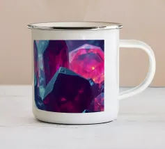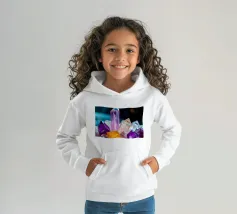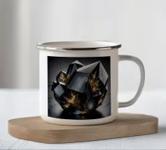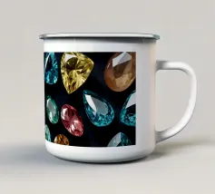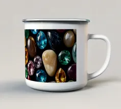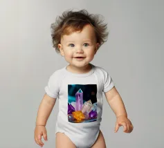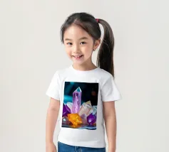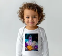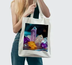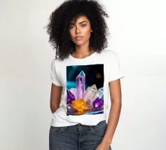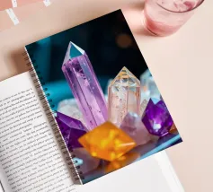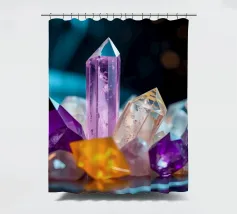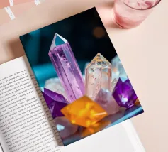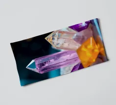 Cristalli di quarzo di varie forme e colori, tra cui viola, arancione e chiaro, sono disposti su una superficie riflettente all'interno di uno studio creativo.