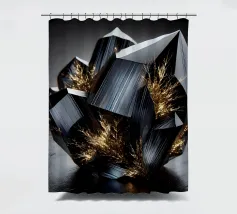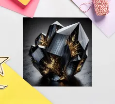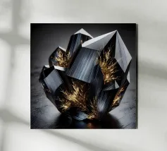 Un cristallo nero lucido con inclusioni dorate e scintillanti. La combinazione di riflessi di luce e strutture angolari conferisce all'opera un aspetto mistico, quasi extraterrestre.Cristallo lucido con riflessi metallici