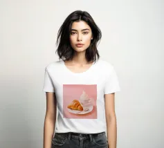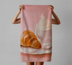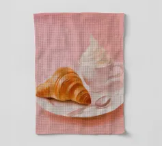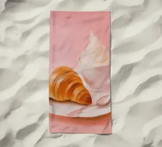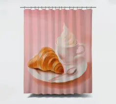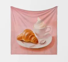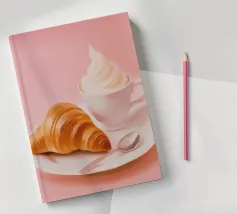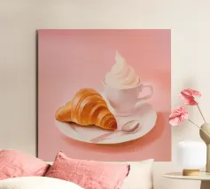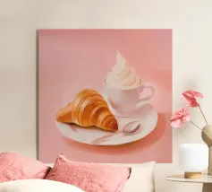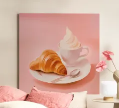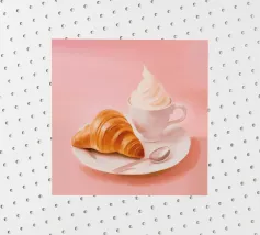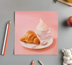 Una delicata composizione da colazione parigina con croissant e caffè in tenui colori pastello.