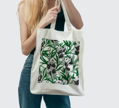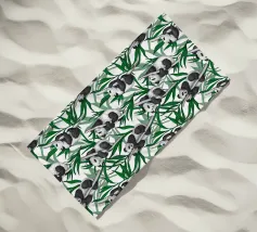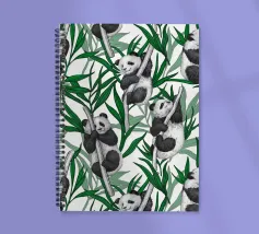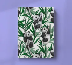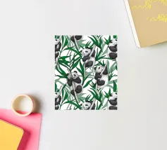 Motivo disegnato a mano con cuccioli di panda gigante che si arrampicano su rami e foglie di bambù.