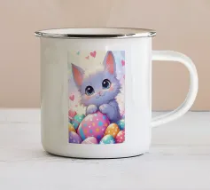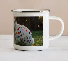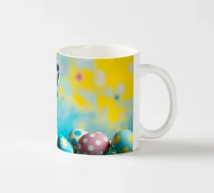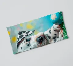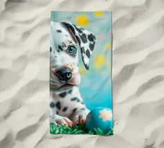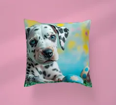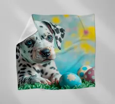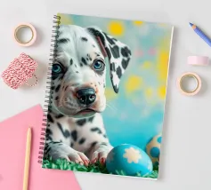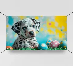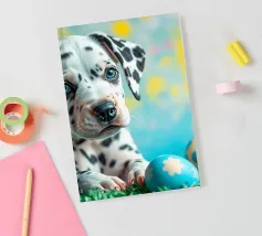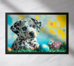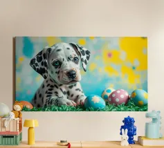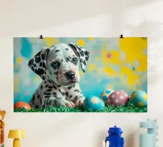 Un giocoso cucciolo di dalmata dagli straordinari occhi blu indaga con curiosità su una serie di uova di Pasqua decorate sparse sull'erba verde. Lo sfondo luminoso e colorato esalta l'atmosfera gioiosa.