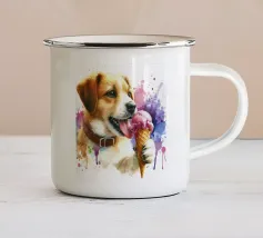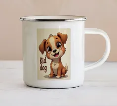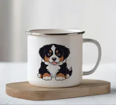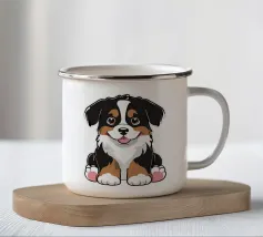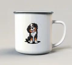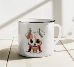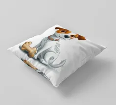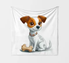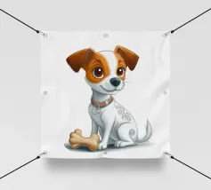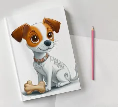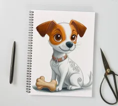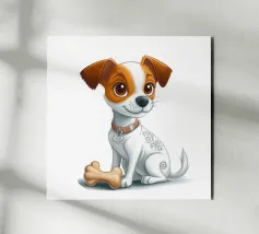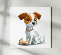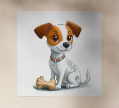 L'immagine raffigura un adorabile cane in stile cartone animato con una espressiva pelliccia bianca e marrone, grandi occhi rotondi e un'espressione allegra. Il cane indossa un collare marrone con una targhetta circolare con la scritta "AHI". Sul corpo ha un disegno unico di vortici e motivi che aggiungono un tocco di creatività. Seduto in posizione eretta, il cane è raffigurato accanto a un osso giocattolo marrone chiaro, che sottolinea la sua natura giocosa. Lo sfondo è bianco e conferisce all'illustrazione un aspetto pulito e minimalista.