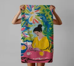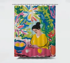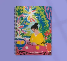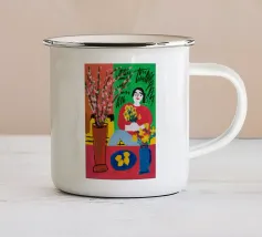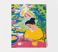 Una scena vibrante ed energica di una donna che cucina in una cucina piena di colori e di piante rigogliose. L'opera è una celebrazione gioiosa e massimalista della creatività e della passione per la cucina.