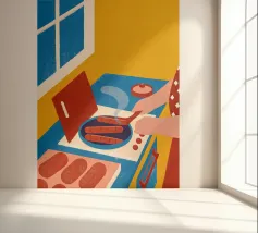 L'illustrazione "Cucinare le salsicce" mostra la cottura delle salsicce in uno stile attraente e appetitoso.
