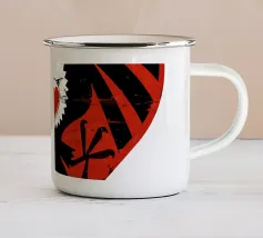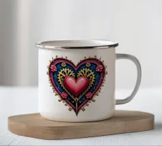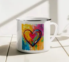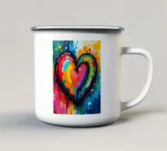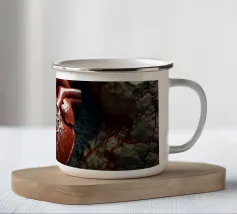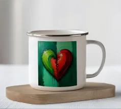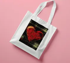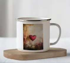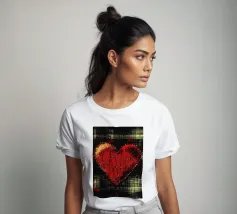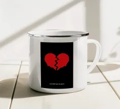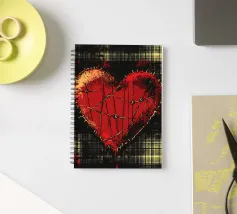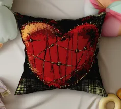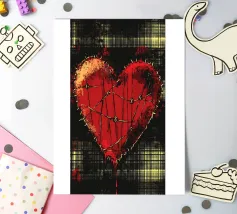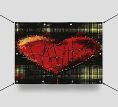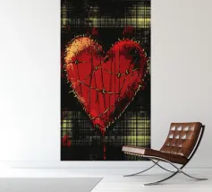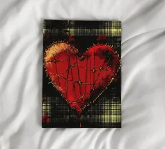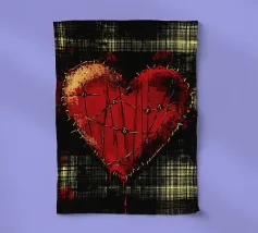 Un cuore rosso sangue tenuto insieme da punti su uno sfondo scuro e strutturato. Le macchie di sangue e i colori grezzi conferiscono al motivo un aspetto ribelle e vulnerabile, fortemente ispirato allo stile punk.