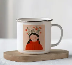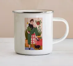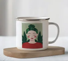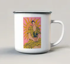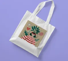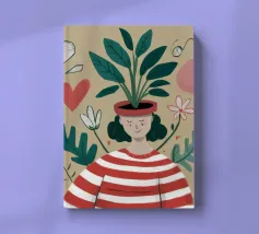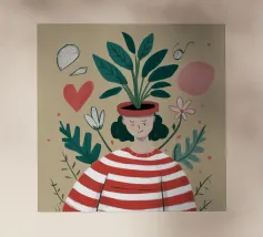 Un'illustrazione stravagante e surreale di una persona con un top a righe, la cui testa è un vaso con un cuore, da cui cresce una pianta. L'opera è una metafora creativa e affascinante della crescita, dell'amore per se stessi e del nutrimento della mente.