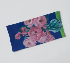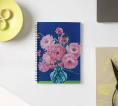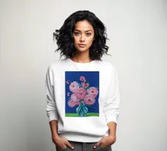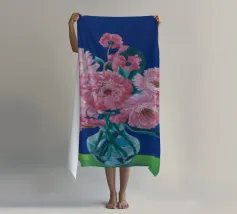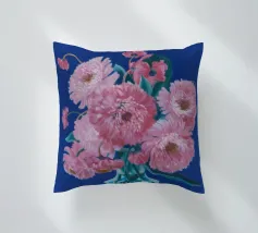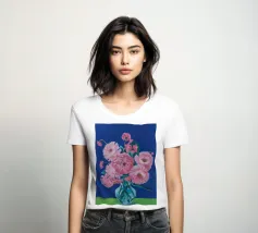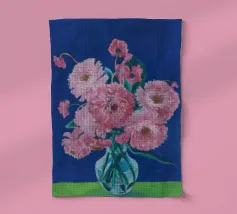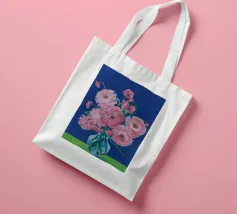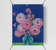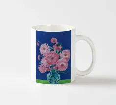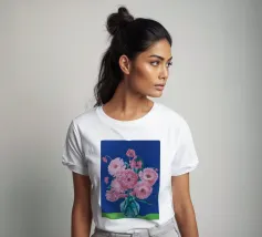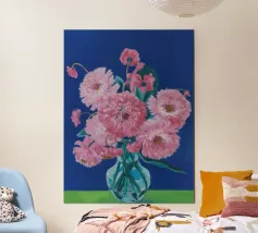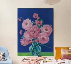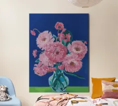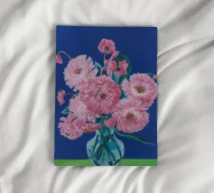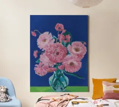 Un bellissimo dipinto impressionistico di un bouquet di fiori di dalia rosa in un semplice vaso di vetro, su uno sfondo verde scuro, che cattura i loro petali morbidi e stratificati.