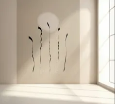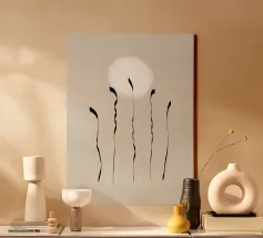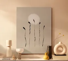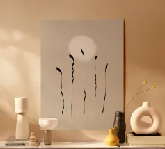 Danza al chiaro di luna. Opera d'arte minimalista con texture morbide e pennellate nere in un cerchio organico su sfondo beige. Opera d'arte moderna e astratta per interni giapponesi, bohémien, minimalisti, moderni e basici. Perfetto per chi apprezza il minimalismo e la semplicità. Adatto a soggiorni, uffici, camere da letto e corridoi.
