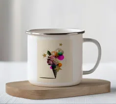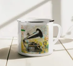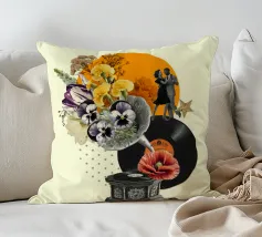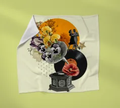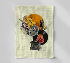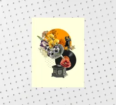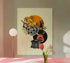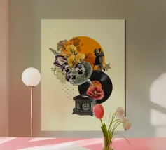 Una nostalgica stampa d'arte a collage che unisce fascino vintage e romanticismo. Un grammofono ornato esplode di fiori vivaci e dischi in vinile, mentre una coppia che balla cattura la magia della musica senza tempo. Un'opera d'arte da parete perfetta per gli amanti della musica, per gli appassionati di arredamento retrò o per chiunque sia attratto dalla narrazione di storie sentimentali attraverso il design.