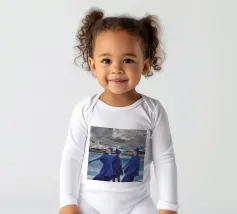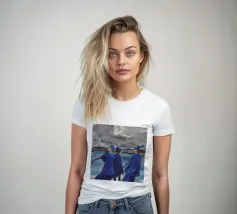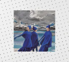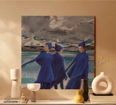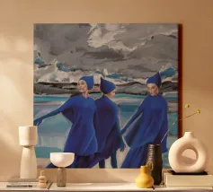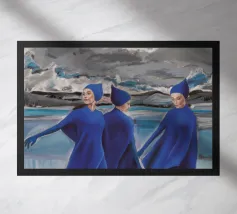 Tre figure volteggiano in un blu vibrante contro un cielo cupo, un balletto drammatico di forza, ritmo e sfida.