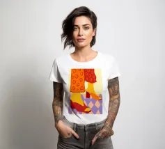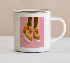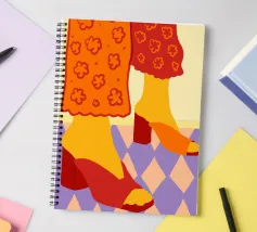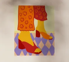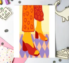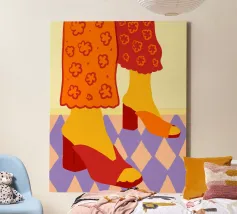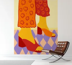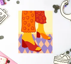 "Dancing Across Checkered Dreams" cattura il vibrante contrasto di piedi gialli con tacchi rossi, ornati da audaci pantaloni floreali, mentre camminano su un pavimento a scacchi bianchi e neri. Questa composizione giocosa fonde colori vivaci e motivi geometrici, creando un'immagine dinamica e accattivante.