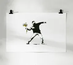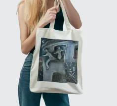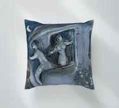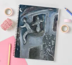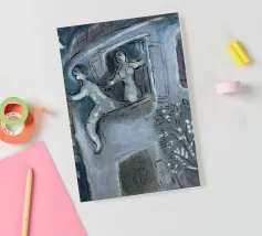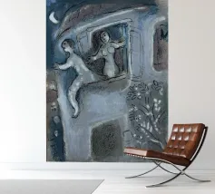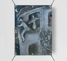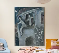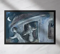 Questa litografia di Marc Chagall illustra una scena biblica, probabilmente raffigurante il re Davide che fugge da una finestra mentre la moglie Michal fa la guardia. Eseguita nella caratteristica tavolozza blu, grigia e bianca di Chagall, cattura un momento di dramma, lealtà e passione. Le figure sognanti e fluttuanti e la semplice ambientazione architettonica trasmettono una narrazione emotiva e senza tempo.