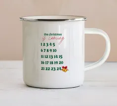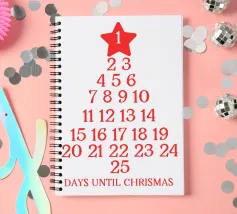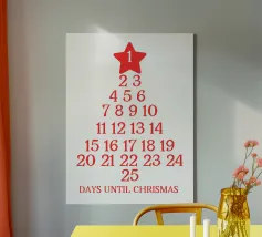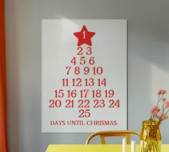 Una stella rossa sovrasta una piramide di numeri che contano i giorni che mancano al Natale, disposti a mo' di albero di Natale. I numeri sono in grassetto e di grande effetto, con la scritta "DAYS UNTIL CHRISTMAS" alla base.