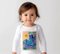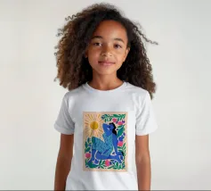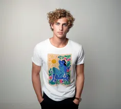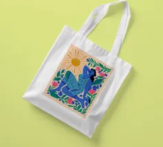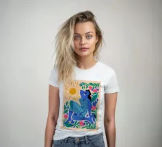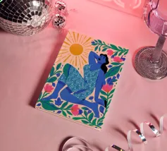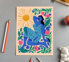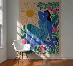 Una figura stilizzata di donna di colore blu, come una dea, si adagia serenamente in un paesaggio vibrante di fiori sotto un sole radioso. L'opera è una potente celebrazione spirituale dell'energia femminile e della natura.