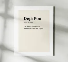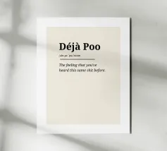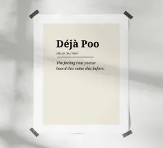 L'ultima spiritosa decorazione per la casa, l'ufficio o il caffè del mattino! Questo design tipografico minimalista definisce il concetto di "Déjà Poo", quella sensazione inquietante di aver già sentito la stessa cosa. Una rivisitazione del noto "Déja Vù". Disponibile come poster di alta qualità, quaderno, borsa resistente o tazza. Perfetto per essere regalato o per aggiungere umorismo al vostro spazio.