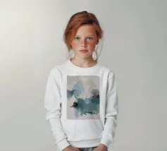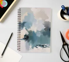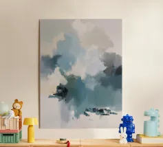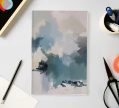 Un astratto morbido e d'atmosfera con forme di nuvole alla deriva nei toni del blu ceruleo, del grigio e del bianco, accentuati da un rosa tenue, che evocano un cielo calmo e ampio e un movimento delicato.