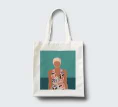 Questo disegno colorato mostra una donna stilizzata con un costume da bagno a fantasia dal sapore retrò. Il motivo marino astratto di coralli, alghe e onde conferisce al motivo una leggerezza estiva e una profondità grafica.