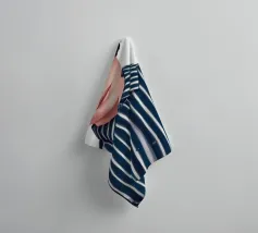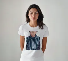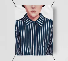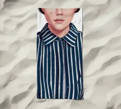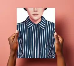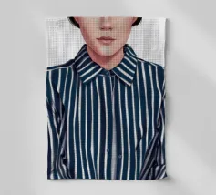 Un'illustrazione ravvicinata che si concentra sul modello pulito e classico di una camicia a righe bianche e blu. Il pezzo è uno studio minimalista, chic e senza tempo di un classico della moda.