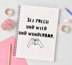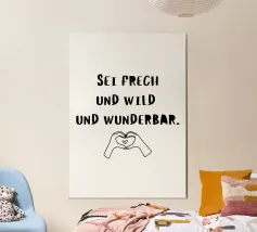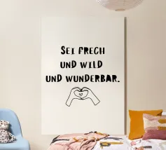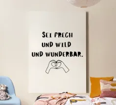 La breve e potente frase "Sii audace, selvaggio e meraviglioso" e una mano che forma un cuore. Questo motivo simboleggia l'amore per se stessi, l'autenticità e la compassione. La combinazione di lettere e immagini ha un effetto caldo, stimolante e positivo.