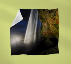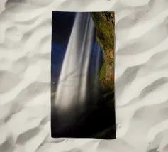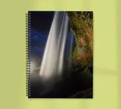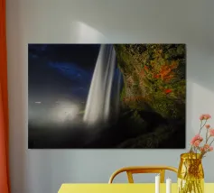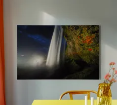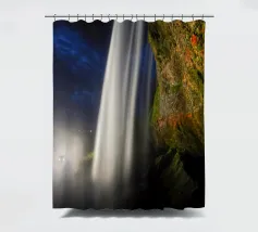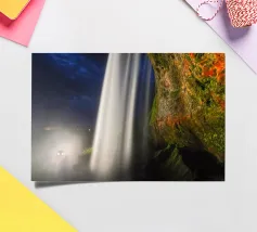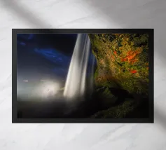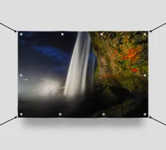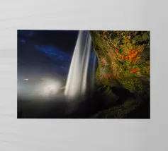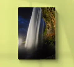 Fotografia notturna dietro la cascata Seljalandsfoss in Islanda.