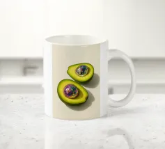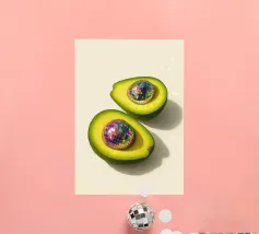 Due metà di avocado con noccioli lucidi di palla da discoteca su uno sfondo rosa brillante, che unisce divertimento e vibrazioni retrò.