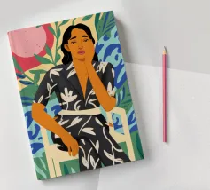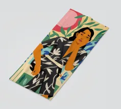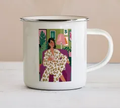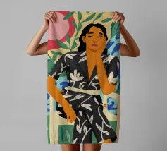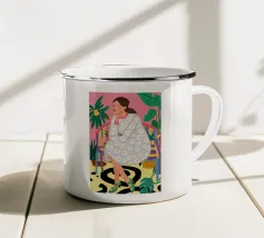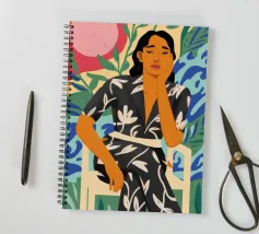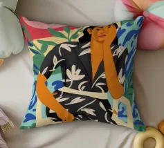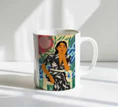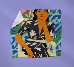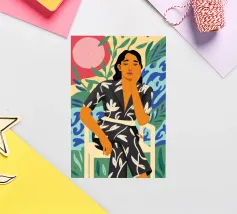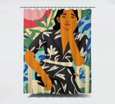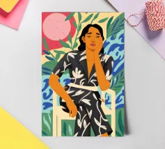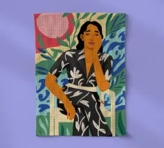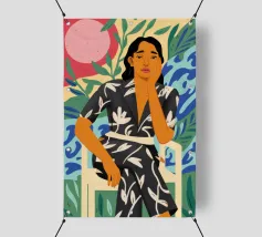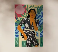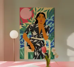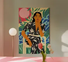 Una donna elegante in un abito a motivi bianchi e neri si rilassa pensierosa, circondata da pareti rosa e piante verdi, in uno stato di sogno ad occhi aperti.