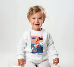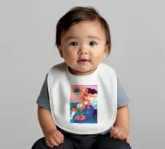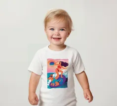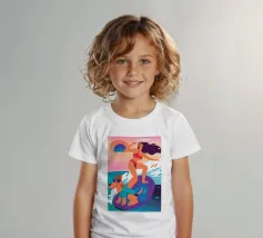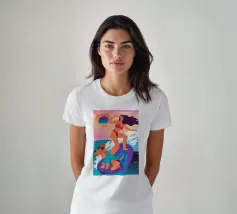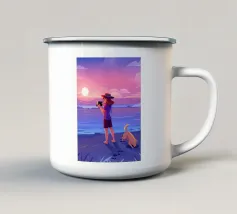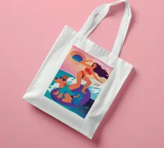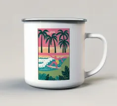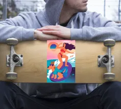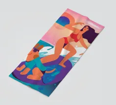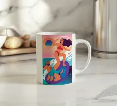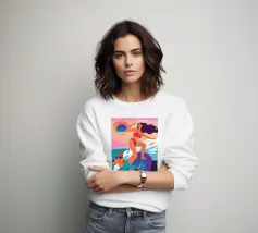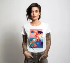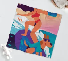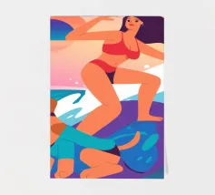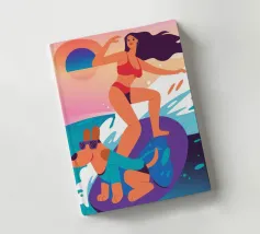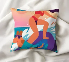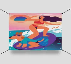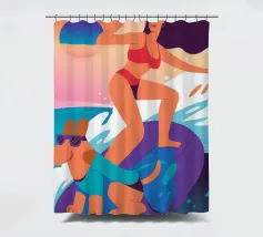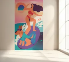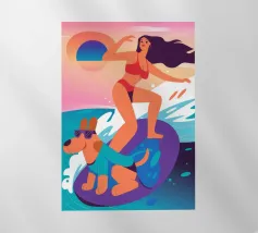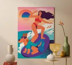 Questa immagine raffigura una donna in bikini rosso che cavalca il dorso di un grosso cane mentre fa surf su un'onda. Lo sfondo è caratterizzato da un tramonto colorato con un cielo sfumato che passa dal blu all'arancione.