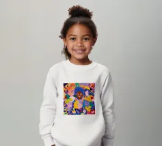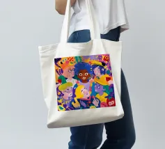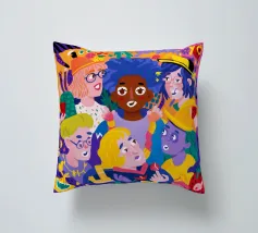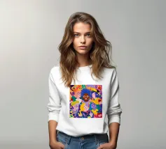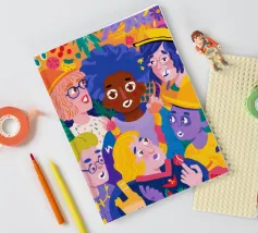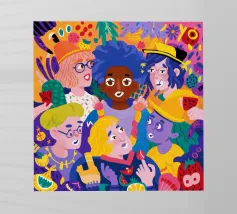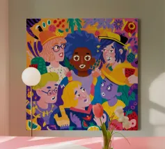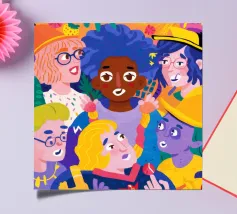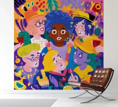 Un'allegra folla di ragazze con diverse tonalità di pelle e stili si gode le risate e l'amicizia in una scena colorata.