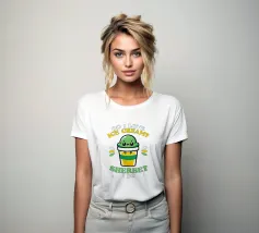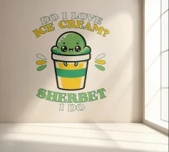 Una simpatica e sorridente pallina di gelato verde è appollaiata su una coppetta colorata, accompagnata da un testo giocoso che recita: "Amo il gelato? Sherbet I do". Il design audace e i colori vivaci creano un'atmosfera allegra e stravagante.
