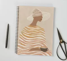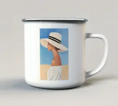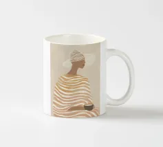 Estetica minimalista a righe e palette di colori tenui: l'opera ricorda l'eleganza grafica degli anni Venti e la sottile stilizzazione del movimento Art Déco, mentre le linee fluide creano una leggerezza molto moderna. La donna, avvolta in tessuti a righe e in un grande cappello, emana una profonda serenità. L'immagine evita deliberatamente i contrasti aspri e si affida invece a passaggi morbidi e a uno schema di colori quasi monocromatico, color caffelatte, per creare un'atmosfera rilassante e distesa. È una testimonianza di stile, di calma e di uno stile di vita elegante.