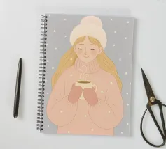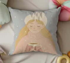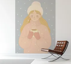 Un'accogliente scena invernale natalizia di una ragazza con un morbido maglione rosa e guanti abbinati. Indossa un cappello rosa chiaro e soffice, mentre tiene in mano una tazza di cioccolata calda, circondata da fiocchi di neve che cadono. Questa illustrazione natalizia evoca sentimenti di calore, pace e semplici gioie durante l'inverno.