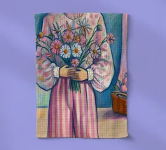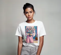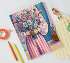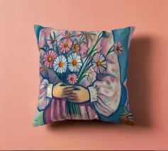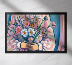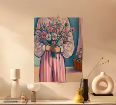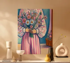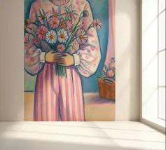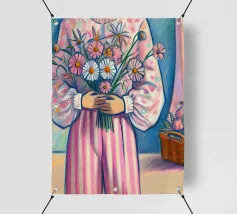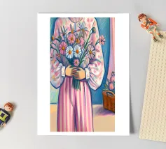 Ritratto di donna calma e rilassata con mazzo di fiori in mano.