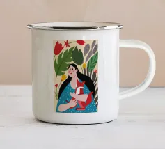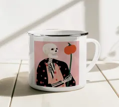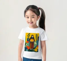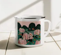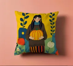 Illustrazione di una giovane donna che raccoglie e tiene in mano una zucca in un campo di zucche. È ricca di colori caldi e autunnali - arancioni profondi, blu ricchi, verdi scuri e giallo oro - che evocano la sensazione dell'autunno o della stagione del raccolto. Cattura anche una scena autunnale piena di calma, natura e tradizione associata al raccolto, al ringraziamento e al ciclo di crescita e cambiamento.