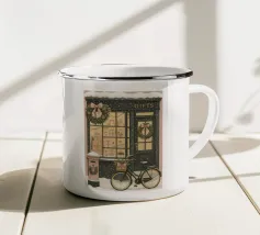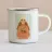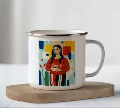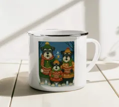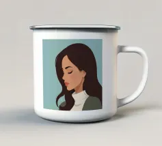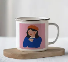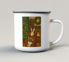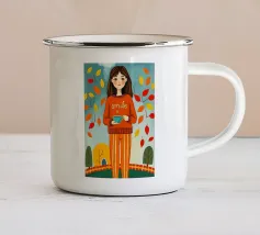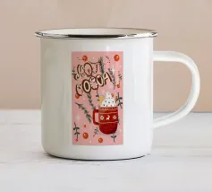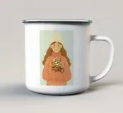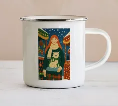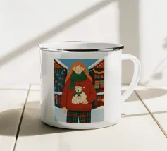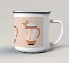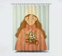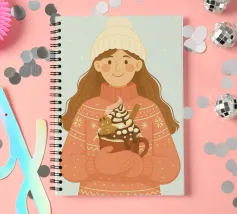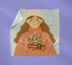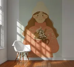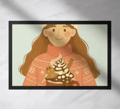 Accogliente opera d'arte natalizia di una giovane donna che indossa un maglione natalizio a maglia grossa con semplici motivi a fiocco di neve. I guanti sono abbinati alla stessa calda tonalità corallo del maglione. Il berretto di lana bianco è sormontato da un pon-pon. Ha in mano una grande tazza di cioccolata calda, con un omino di pan di zenzero, un bastoncino di cannella, panna montata, sciroppo di cioccolato e marshmallow. Questa illustrazione natalizia evoca un senso di gioia casalinga di momenti accoglienti nella stagione invernale.
