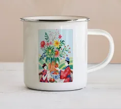 Un ritratto stilizzato di una donna con fluenti capelli scuri circondata da un'abbondanza di fiori e frutti colorati, che celebra la vita, la fertilità e la creatività.