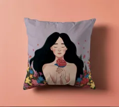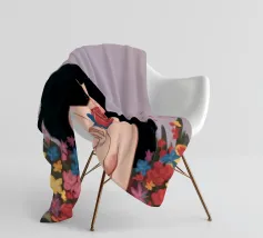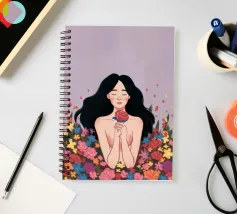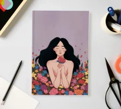 Un ritratto bellissimo e surreale di una donna il cui corpo si dissolve in un bouquet di fiori colorati, che simboleggiano la crescita, la bellezza e una profonda connessione con la natura.