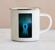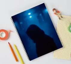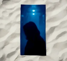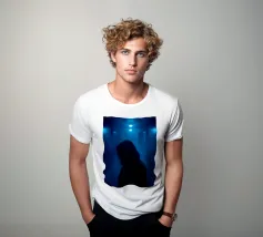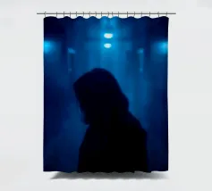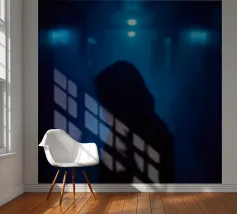 Una figura in ombra si trova in uno stretto corridoio illuminato da luci blu, circondato da un'inquietante nebbia che crea un'atmosfera inquietante in uno spazio buio.
