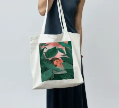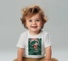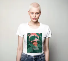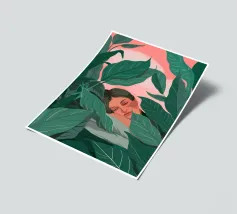 Una serena illustrazione di una persona che dorme pacificamente, avvolta da grandi e rigogliose foglie della giungla. La scena è una rappresentazione bella, intima e tranquilla di una profonda connessione con la natura e di un sonno ristoratore.