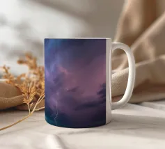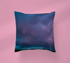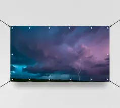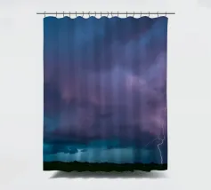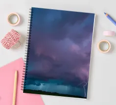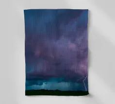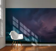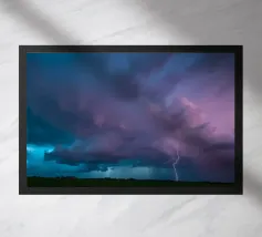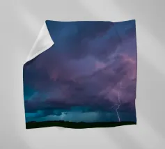 Nuvole scure da temporale si addensano mentre i fulmini illuminano il cielo al crepuscolo in campagna. Un senso di tensione riempie l'atmosfera con l'avvicinarsi del temporale.