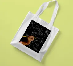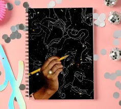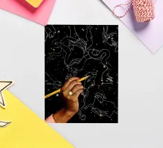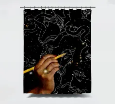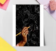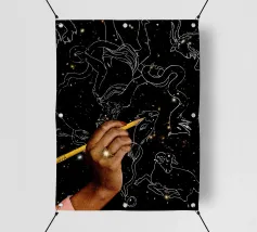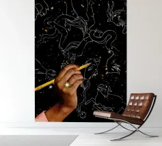 Surreale collage vintage di MsGonzalez. Mano di una donna (dea) che disegna costellazioni nello spazio.