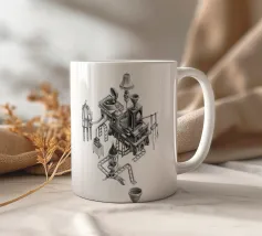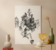 Disegnata a mano con una semplice penna, quest'opera rivela uno spazio immaginario in cui si fondono architettura e forme surreali.