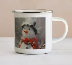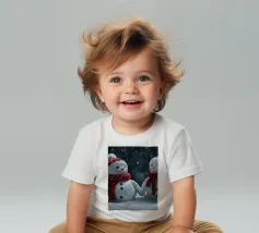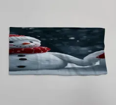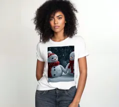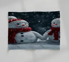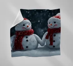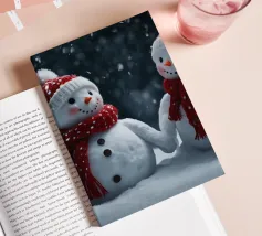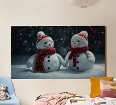 I due pupazzi di neve sono mano nella mano e mostrano le loro espressioni amichevoli. Ognuno di loro è adornato con un cappello e una sciarpa, circondato da fiocchi di neve che cadono sotto il cielo notturno invernale.