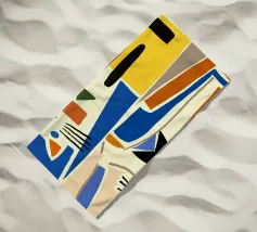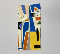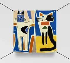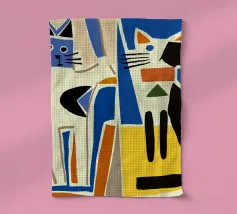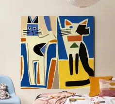 Una rappresentazione colorata e astratta di gatti è raffigurata con blocchi di colore e forme geometriche. I gatti sono stilizzati con caratteristiche esagerate, come occhi grandi e baffi prominenti, su uno sfondo di colore blu e giallo brillante.