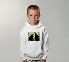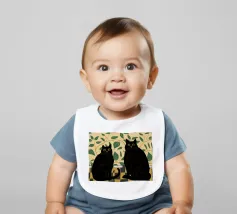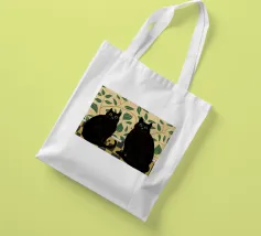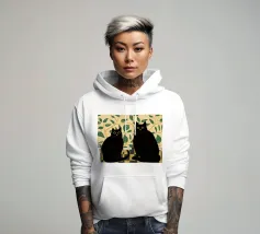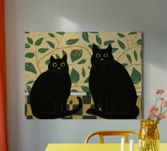 Un ritratto suggestivo e simmetrico di due gatti neri identici seduti in posizione eretta, con i loro occhi penetranti che fissano direttamente lo spettatore dall'interno di una stanza accogliente e piena di piante, creando un'immagine misteriosa e accattivante.
